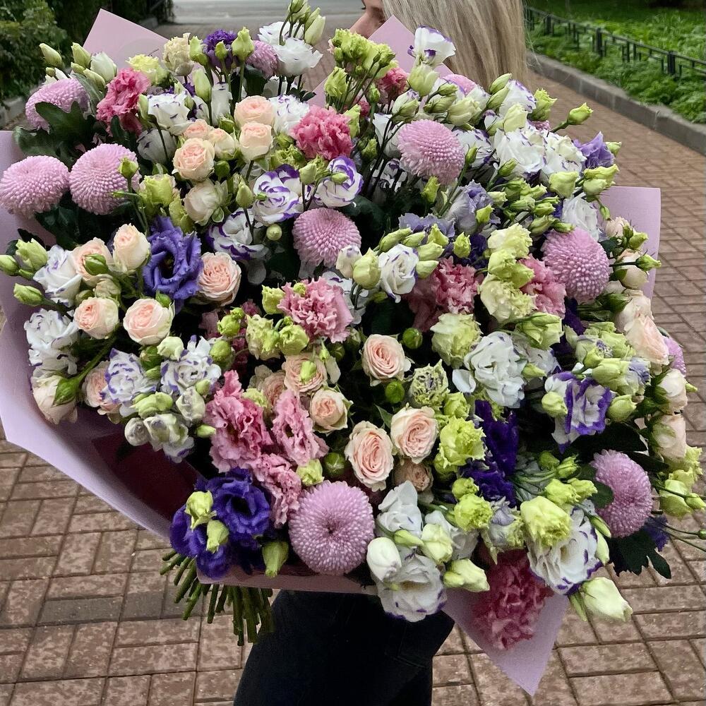 лизтантус микс – 50 шт.Кустовая роза – 9 шт.Хризантема одноголовая – 9 шт.Упаковка дизайнерская – 1 шт.Открытка – 1 шт.