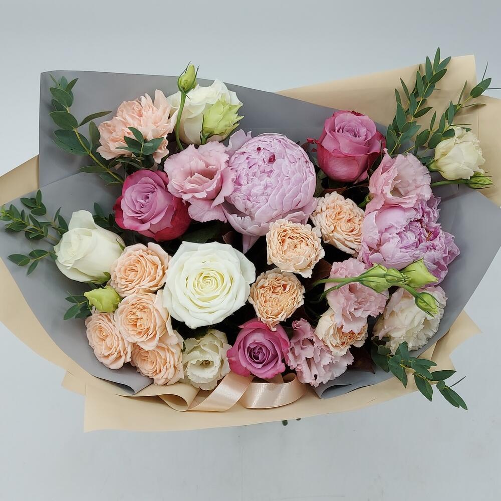 Пион – 2 шт.Роза кустовая – 3 шт.Эвкалипт – 3 шт.Роза Эквадор – 6 шт.Эустома – 3 шт.Упаковка дизайнерская – 1 шт.зелень стаффажная – 6 шт.гвоздика сортовая (диантус) – 1 шт.
