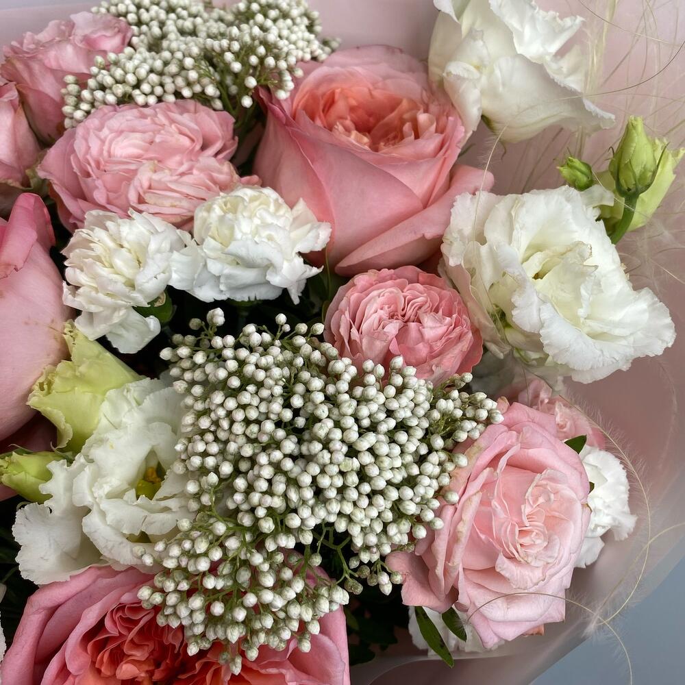 Лизиантус – 2 шт.Озотамнус – 2 шт.Гвоздика кустовая – 3 шт.Фисташка – 1 шт.Роза пионовидная – 3 шт.Роза кустовая пионовидная – 3 шт.Упаковка дизайнерская – 2 шт.Стифа – 2 шт.комплимент от polyanka – 1 шт.