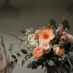 Букет с ранункулюсами, амариллисом, пионовидными розами, эвкалиптом и маттиолой.