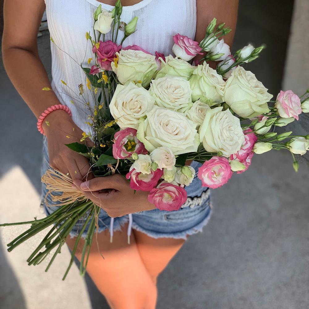Розовые эустомы и белые розы