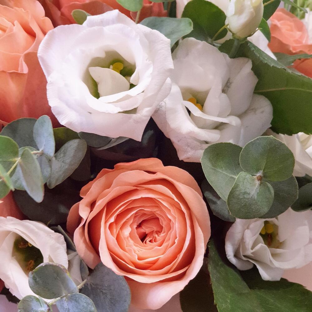 Роза Капучино – 3 шт.Эвкалипт – 3 шт.Лента атласная – 2 шт.Лизиантус белый – 5 шт.Открыточка с вашими пожеланиями – 1 шт.Оазис флористический – 1 шт.коробка шляпная крафт – 1 шт.