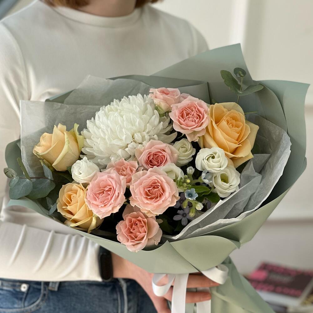 Сборный букет цветов с нежнейшей хризантемой и райскими розовыми розами: покорит сердце любой девушки, подарит настроение на весь день бабушке, сделает счастливой любимую тетю! А также воодушевит руководителя, очень обрадует маму