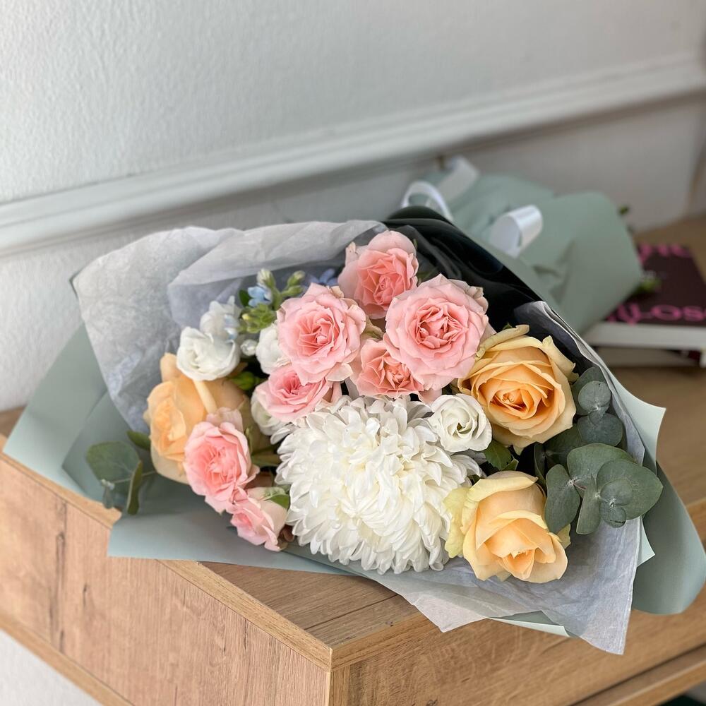 Сборный букет с одноголовой хризантемой и розами «Принцесса Нурри» 44