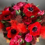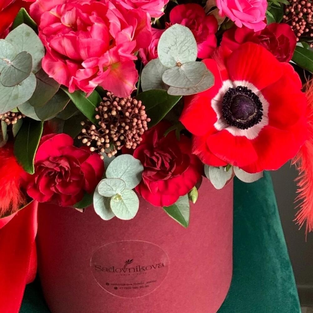 Анемон красный – 4 шт.Роза кустовая – 3 шт.Скиммия – 3 шт.Диантус кустовой – 4 шт.Тюльпан – 3 шт.Эвкалипт – 2 шт.Шляпная коробка – 1 шт.перья декор – 4 шт.