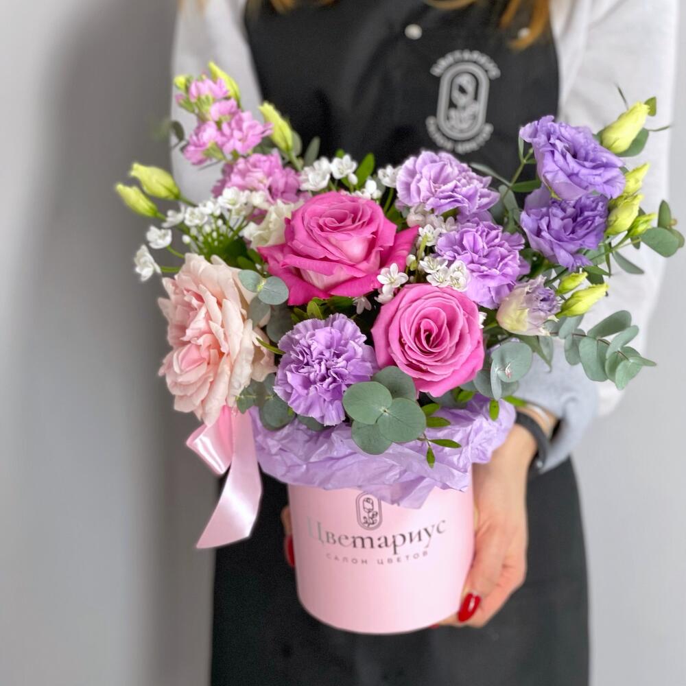 Шляпная коробка с яркими розовыми и фиолетовыми цветами, в центре которой находится великолепная Пионовидная Роза сорта Цумуги – по-настоящему Королева всех цветов. Яркая гамма, приятный аромат этой композиции с маттиолой, фиолетовыми гвоздиками, лизиантусом придется по … Показать ещёвкусу как юной девушке, там и женщине со статусом.