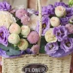 Сантини – 2 шт.Кустовая пионовидная роза – 2 шт.Корзина плетеная – 1 шт.Оазис флористический – 1 шт.Диантус лунный – 3 шт.эустома лавандовая – 2 шт.