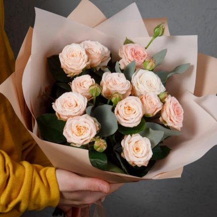Упаковка дизайнерская – 1 шт. Открыточка с вашими пожеланиями – 1 шт. кустовые розы бомбастики – 17 шт.