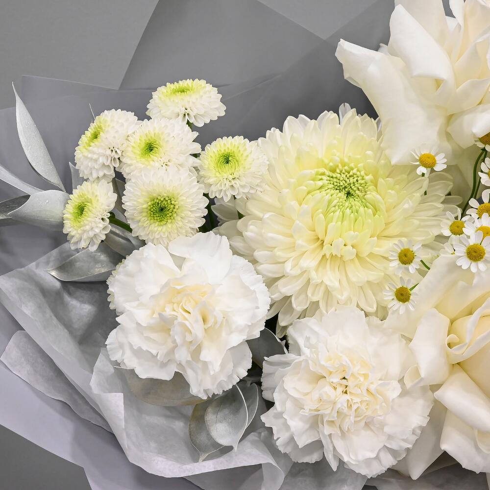 Стильный букет в бело-голубой цветовой гамме. В составе французские розы, сортовая гвоздика, тюльпаны, кустовая ромашка и пышная одноголовая хризантема.Флористы студии Цветочный Этикет собрали его из самых свежих цветов, тщательно продумав состав. Букет готов удивлять … Показать ещёкрасотой своего получателя! Станет идеальным подарком для любимой женщины, дочке или мамы, на День Рождения, юбилей, свадьбу и другие торжественные мероприятия. С букетом вы получите конверт с открыткой, в которой мы напишем любое пожелание, инструкцию свежести и средство для продления жизни срезанных цветов.