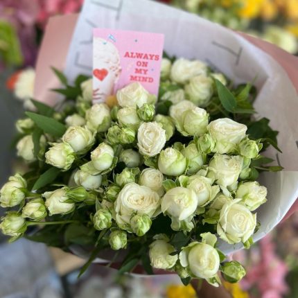 Spray rose – 2 шт. eustoma pinkwhite – 5 шт. Chrysanthemum white – 1 шт. Eucalyptus – 5 шт.
