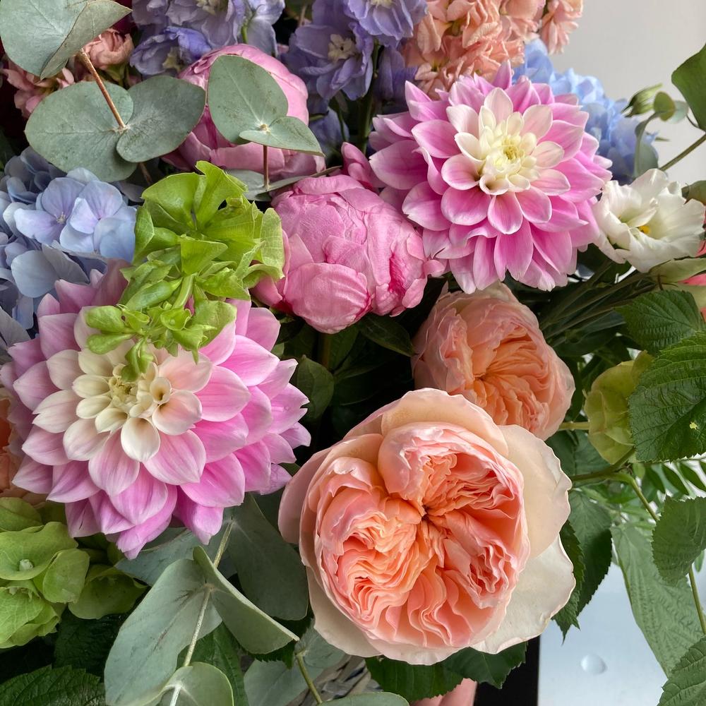 Дельфиниум – 7 шт.Львиный зев – 11 шт.Георгина – 5 шт.Маттиола – 11 шт.Гортензия – 3 шт.Пион – 5 шт.Роза пионовидная – 5 шт.Молюцелла – 5 шт.Лизиантус – 7 шт.Ветки малины – 5 шт.Эвкалипт – 10 шт.Фисташка – 5 шт.Корзина – 1 шт.Оазис – 3 шт.