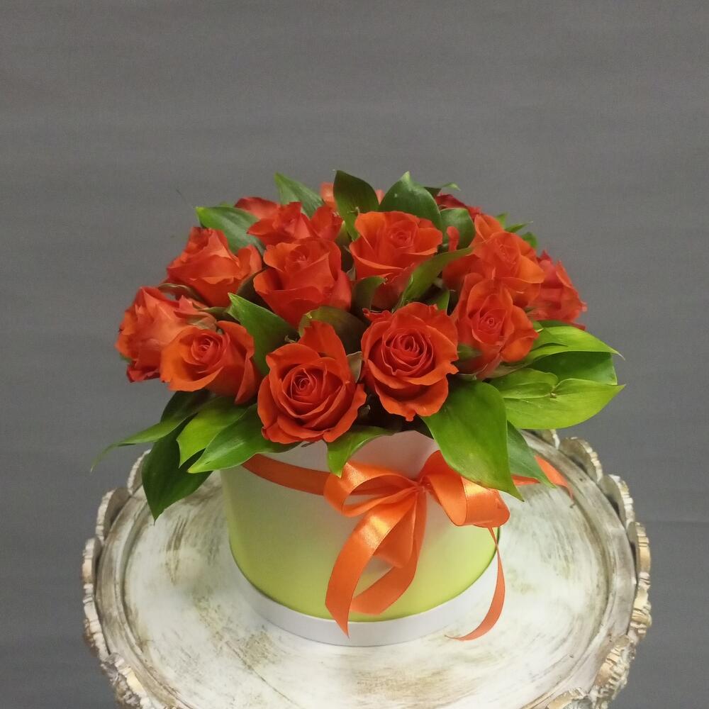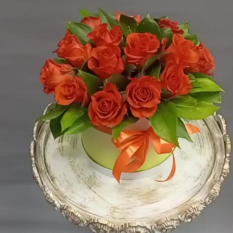 Роза – 17 шт.Зелень – 10 шт.Коробка шляпная – 1 шт.Оазис флористический – 1 шт.