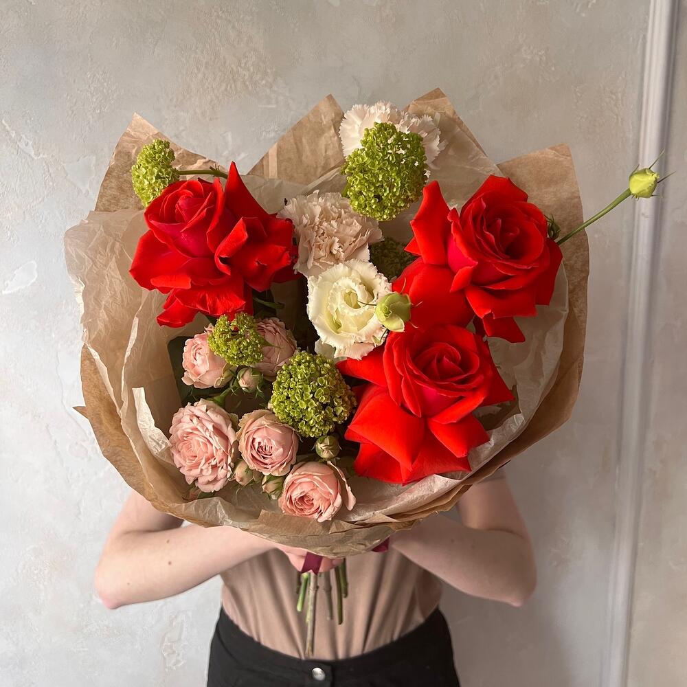 Роза – 4 шт.Вибурнум – 2 шт.Гвоздика – 2 шт.Лизиантус – 1 шт.Авторская упаковка – 1 шт.
