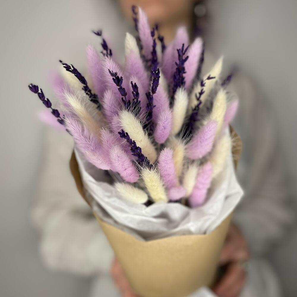Лента – 2 шт.Тишью – 1 шт.Крафт – 1 шт.Лагурус – 42 шт.лаванда стабилизированная – 17 шт.