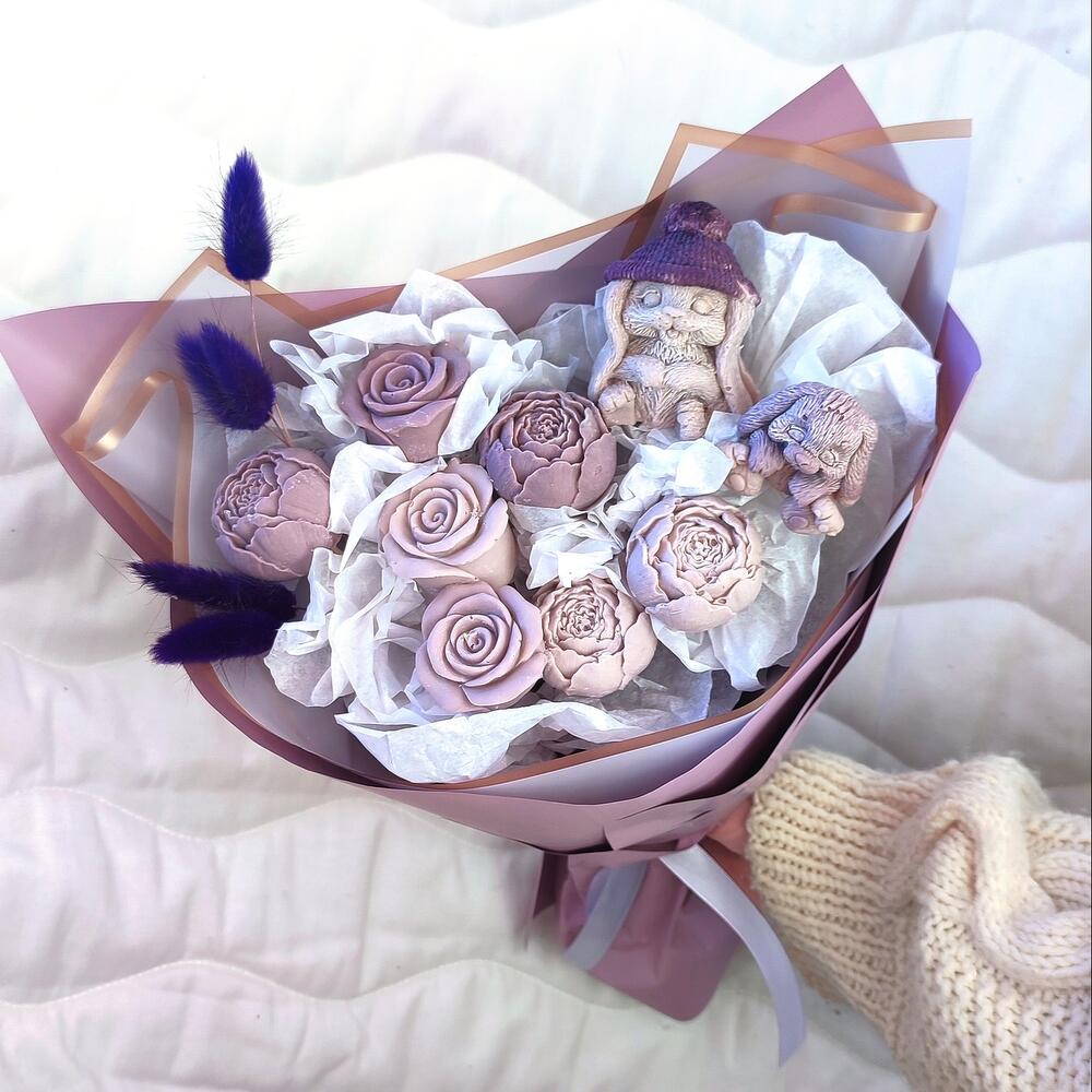 Лента атласная – 1 шт.Упаковка дизайнерская – 2 шт.Лагурус (сухоцвет) – 5 шт.белый бельгийский шоколад callebaut – 9 шт.