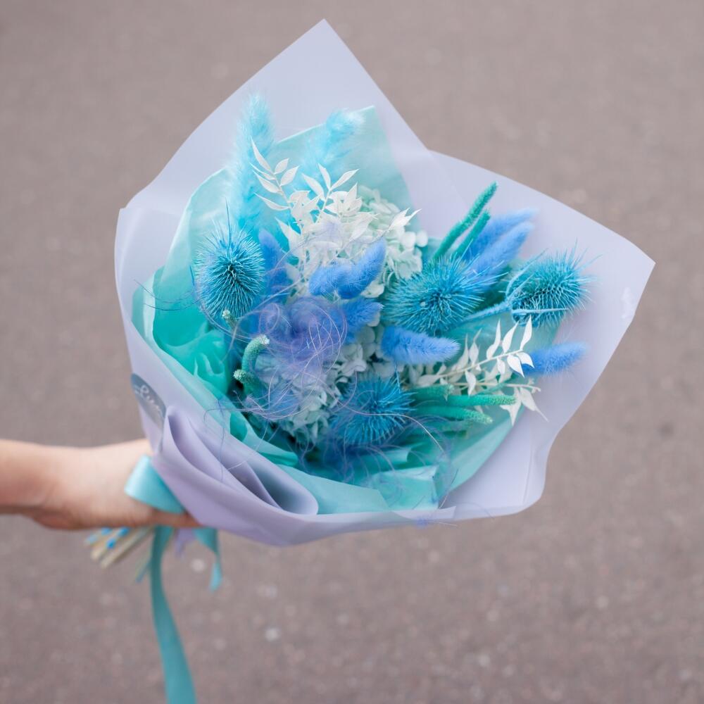 Дизайнерская упаковка – 1 шт.флеум – 3 шт.гортензия сухоцвет – 2 шт.эрингиум сухоцвет – 4 шт.лагурус сухоцвет – 6 шт.рускус сухоцвет – 3 шт.ковыль сухоцвет – 1 шт.пампасная трава (сухоцвет) – 3 шт.