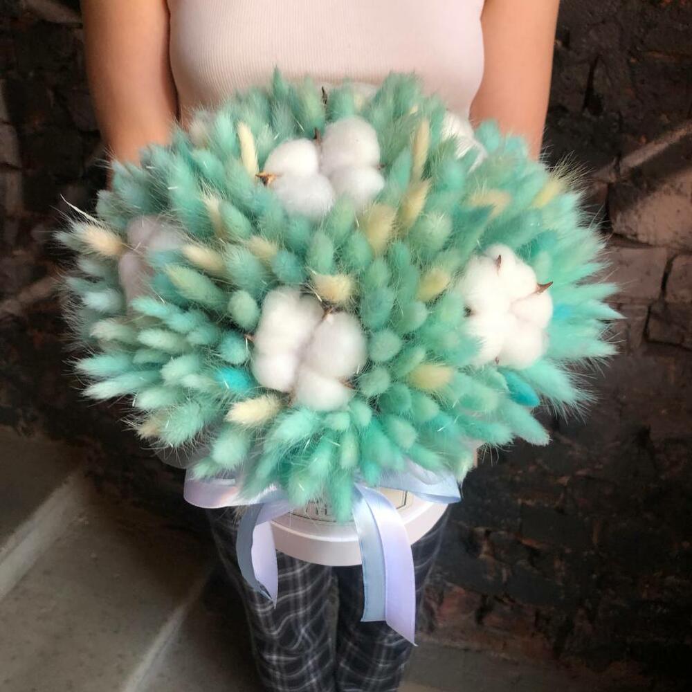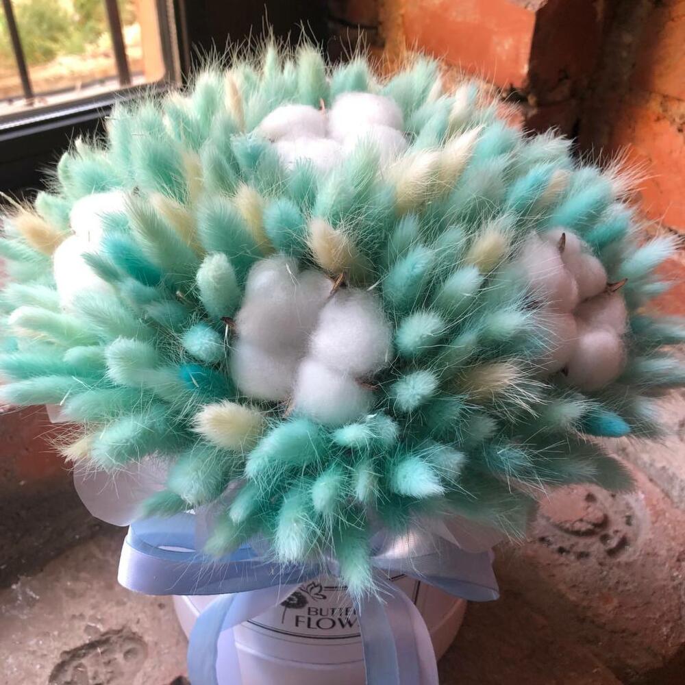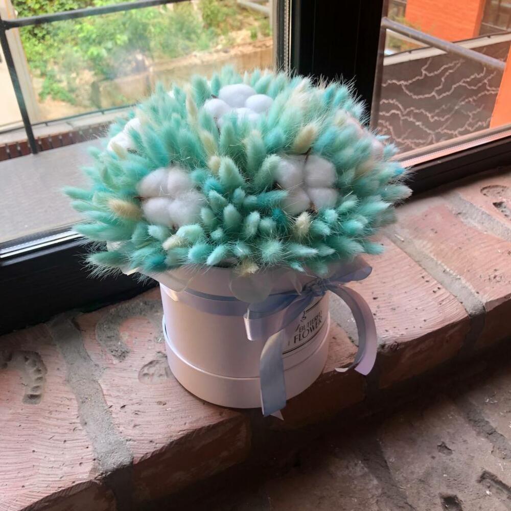 Букет из сухоцветов – лагуруса и хлопка в шляпной коробке «Прикосновение»