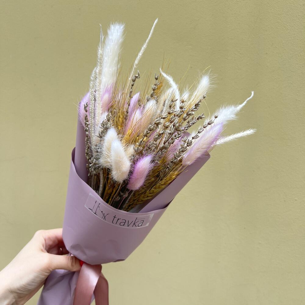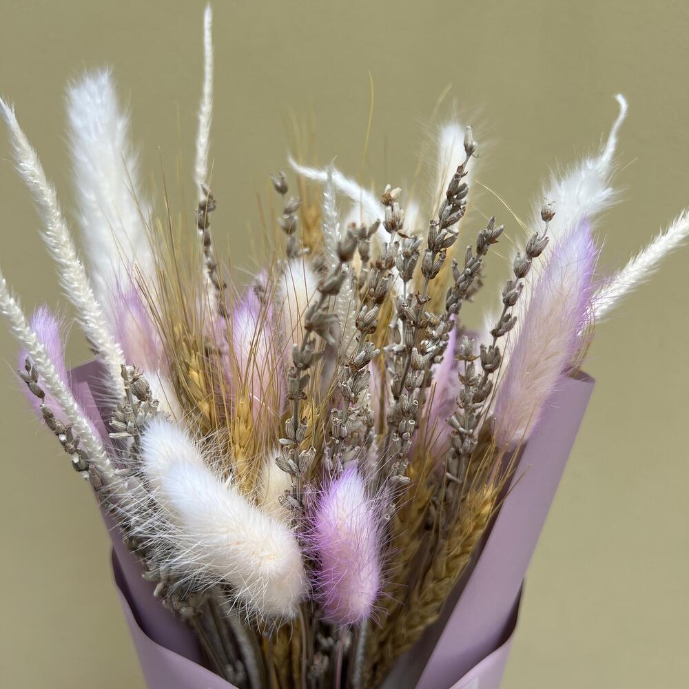 Лагурус – 10 шт.Лаванда – 13 шт.Пшеница – 5 шт.Упаковка дизайнерская – 1 шт.
