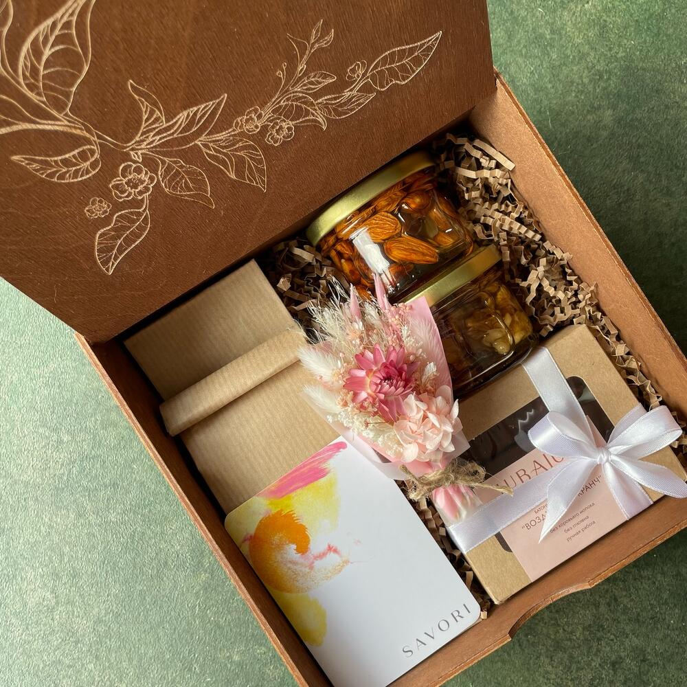 чай зеленый имбирный – 40 гр.иван-чай – 30 гр.миндаль в меду – 100 млгрецкий орех в меду – 100 млшоколадные батончики 2 шт. – 1 шт.букетик сухоцветов – 1 шт.Коробка-шкатулка – 1 шт.