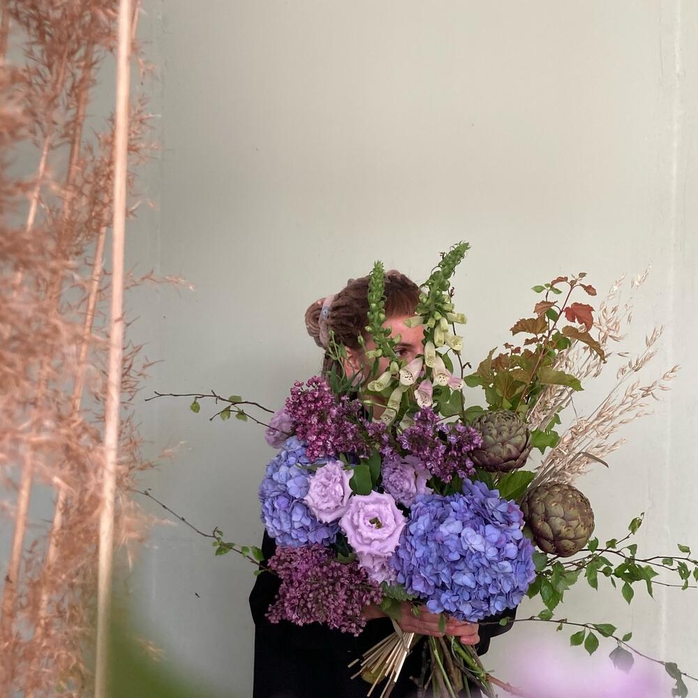 Черничный букет с гортензиями, артишоками, овсом, лизиантусом и наперстянкой.Стильное цветочное решение для любого случая.