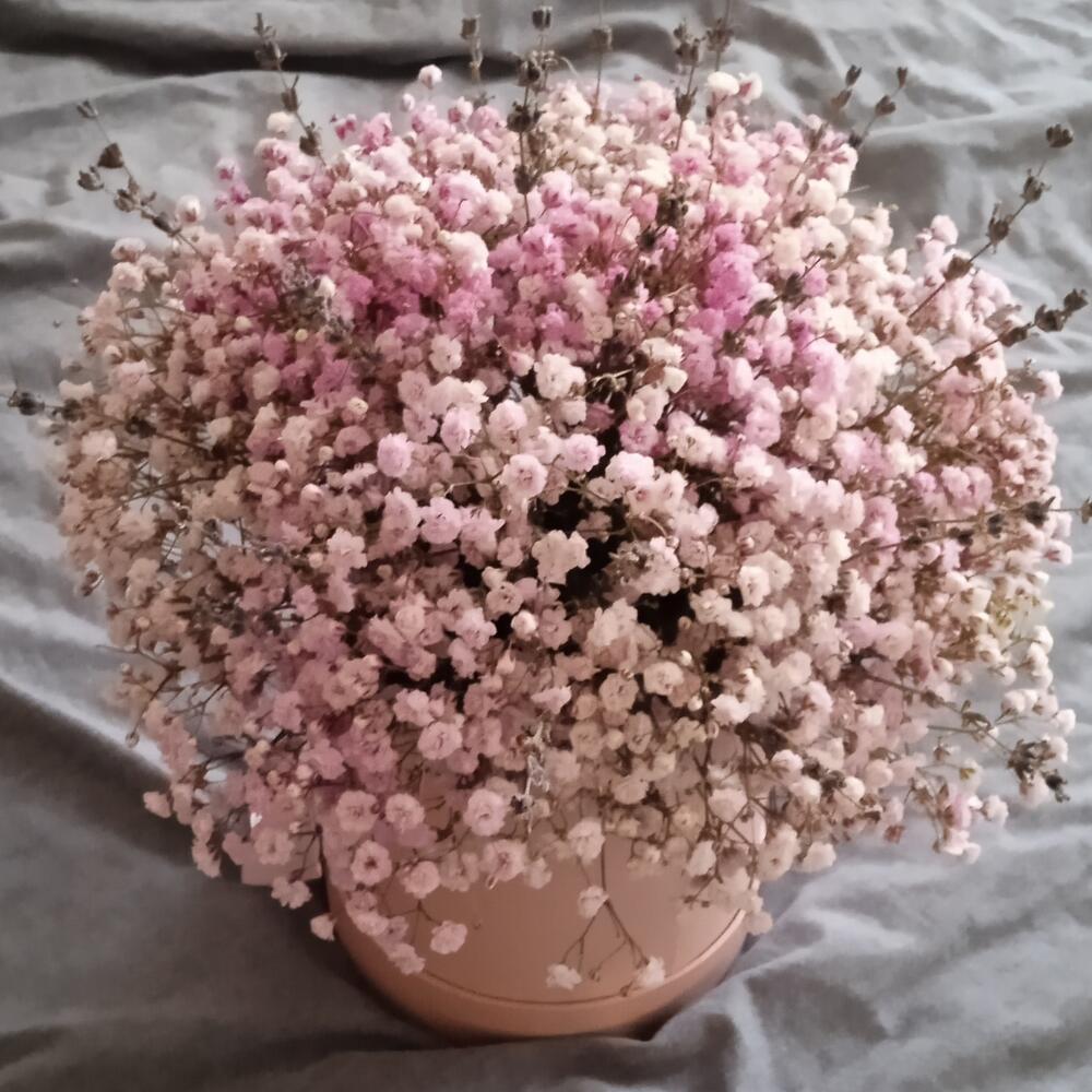 “Сиреневый туман” – композиция из гипсофилы в шляпной коробке