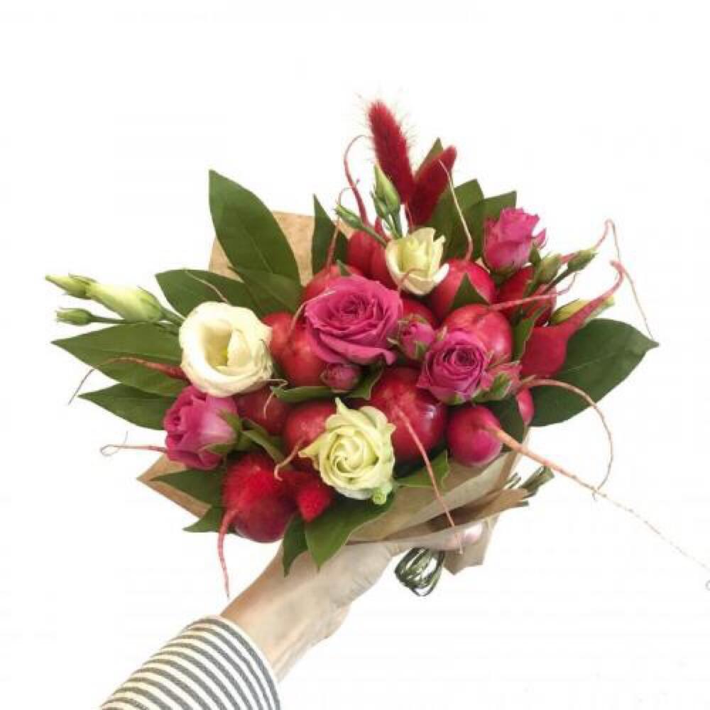 Редис – 6 шт.розы – 4 шт.Эустома – 3 шт.лавр или салал – 8 шт.Лагурус – 2 шт.