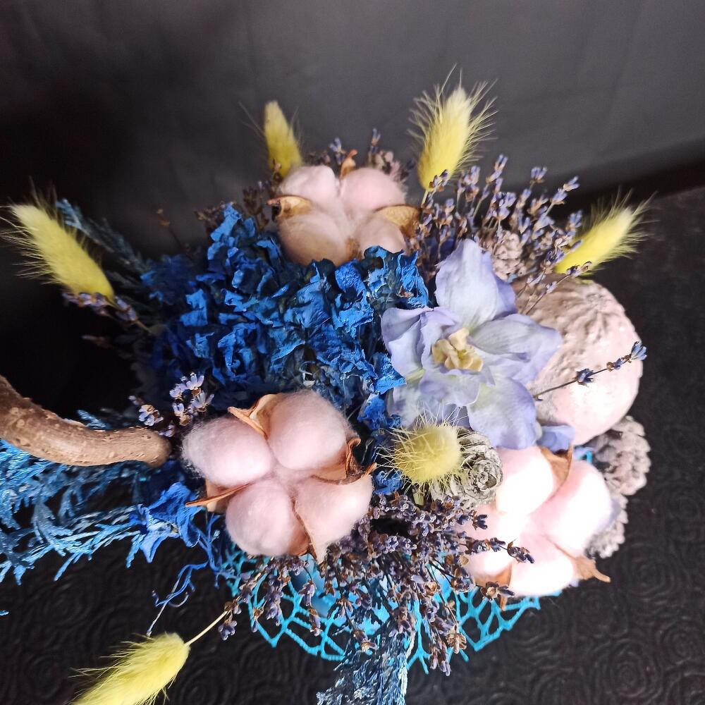 Кашпо керамическое – 1 шт.Оазис флористический – 1 шт.Лаванда (сухоцвет) – 1 шт.Гортензия – 1 шт.Хлопок – 3 шт.Лагурус – 6 шт.цветы искусственные – 4 шт.Шишки натуральные – 5 шт.Туя – 3 шт.Тыква декоративная – 1 шт.