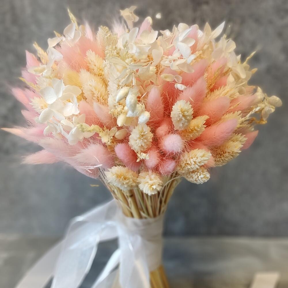 Лента атласная – 1 шт.Колоски – 40 шт.Лента органза – 1 шт.Фаларис – 70 шт.Бриза – 20 шт.Лагурус розовый – 70 шт.гортензия стабилизированная – 1 шт.лагурус нежно розовый – 70 шт.