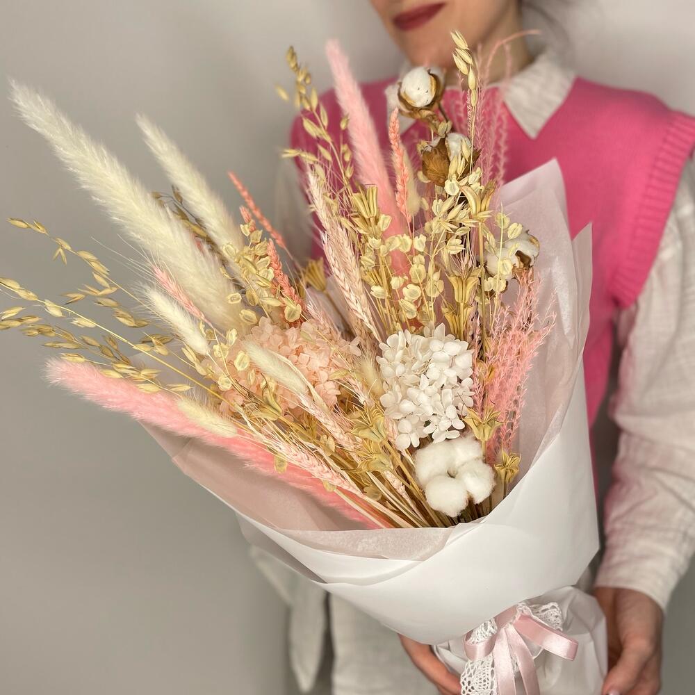 Лента – 2 шт.Колоски пшеницы – 16 шт.Упаковка дизайнерская – 1 шт.Нигелла – 5 шт.Хлопок натуральный – 4 шт.Лагурус (сухоцвет) – 7 шт.овес сухоцвет – 9 шт.гортензия стабилизированная – 2 шт.мискантус – 2 шт.колосья окрашенные – 9 шт.камыш сухоцвет – 4 шт.ярутка сухоцвет – 3 шт.