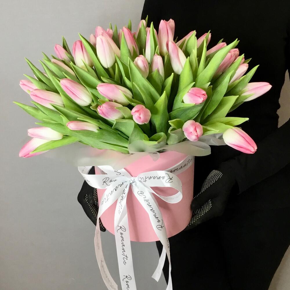 Тюльпан Голландский – 51 шт.Аквабокс – 1 шт.шляпная коробка 18*18 см – 1 шт.Пленка матовая – 1 шт.Лента атласная – 1 шт.