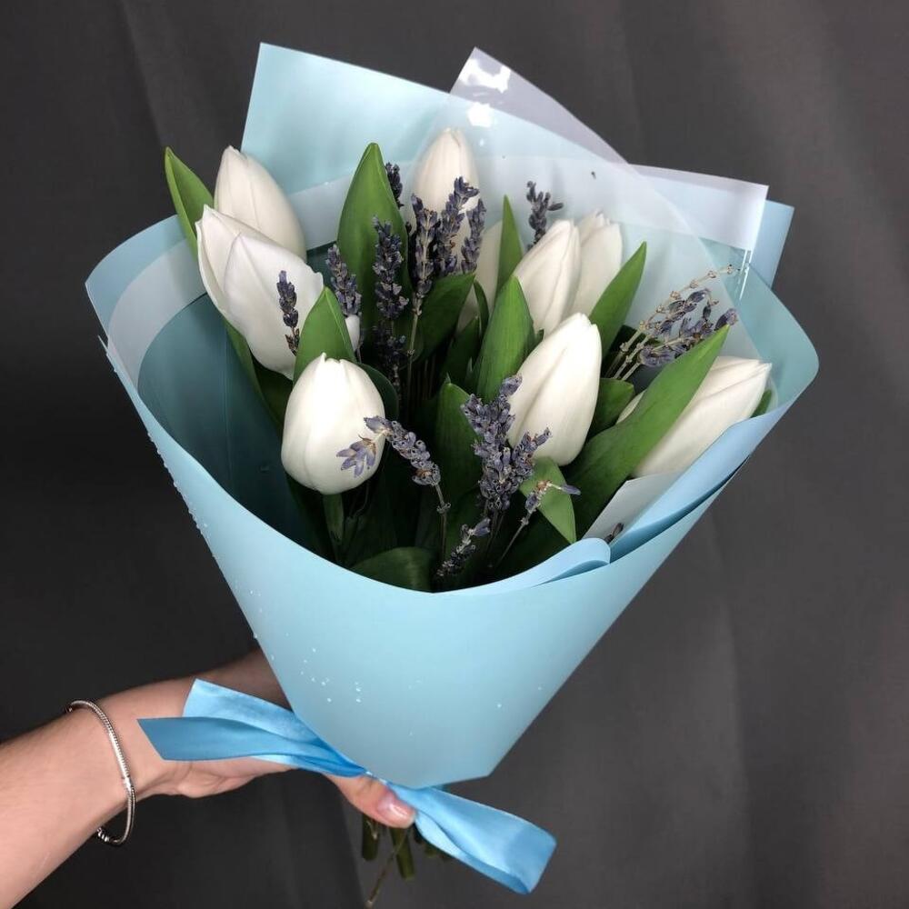 Букет из 9 белых тюльпанов с лавандой