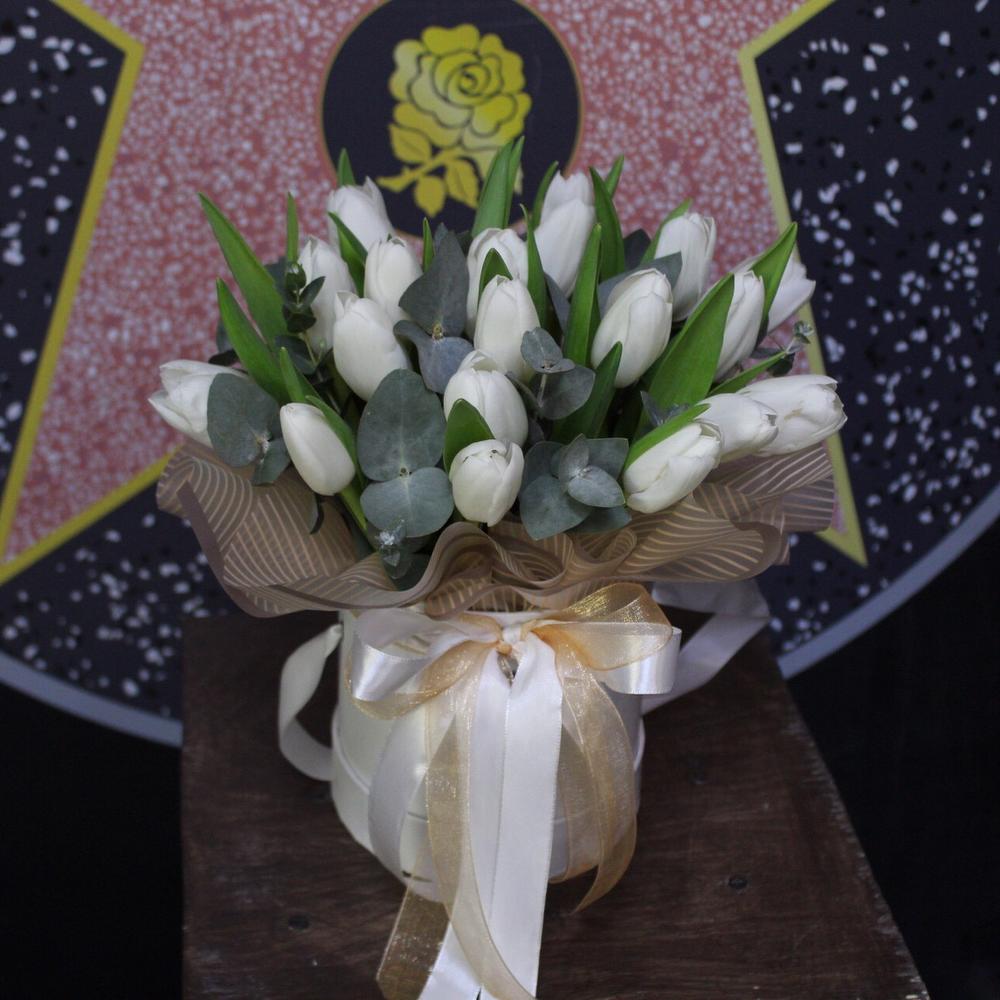Эвкалипт – 2 шт.Шляпная коробка – 1 шт.Тюльпан белый (голландия) – 19 шт.Пленка дизайнерская – 2 шт.