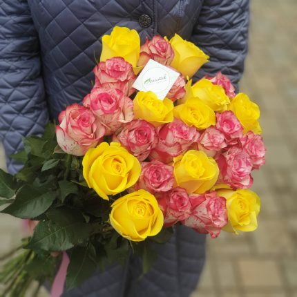 Яркая композиция из французских роз Найтингейл, хризантемы Момоко, ароматных нарциссов и маттиолы с эвкалиптом в коробке